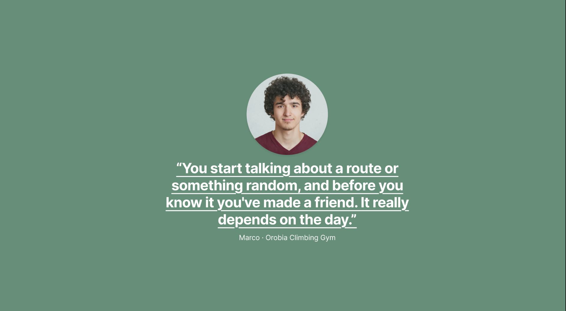 Beginner Hour addresses the growing epidemic of loneliness among young adults in Italy by transforming Orobia Climbing Gym into a supportive social microcosmos, a place where the act of climbing becomes an entry point into genuine human connection.