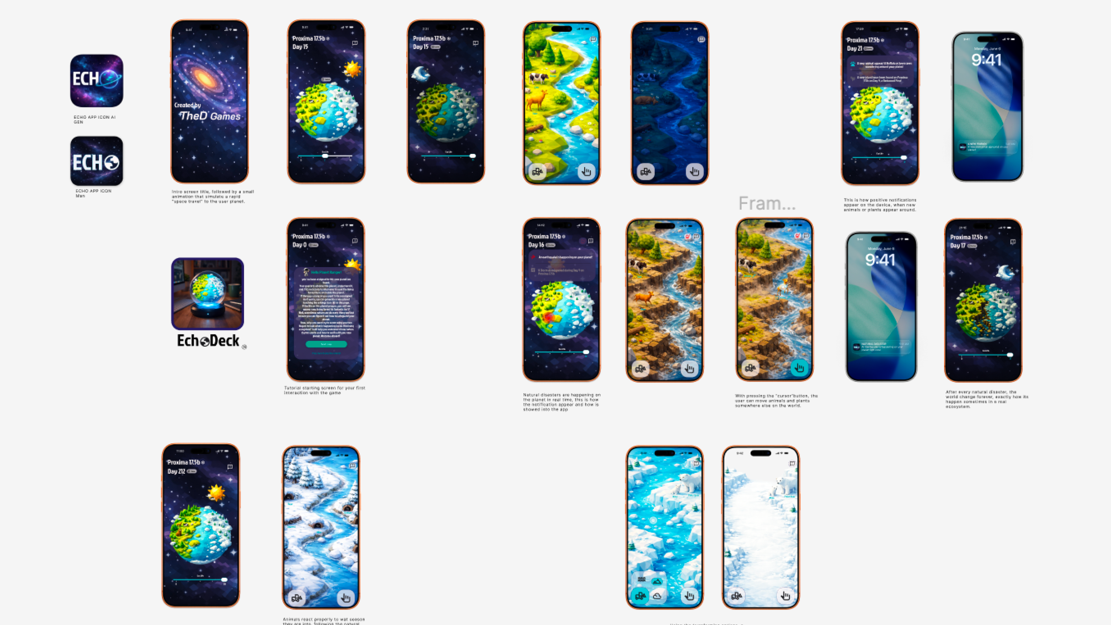 Each player receives a procedurally generated planet populated by plants and animals that evolve according to ecological dynamics rather than numerical schedules. The experience focuses on observation, light interaction, and long-term transformation. Alongside the application, a physical companion device called EchoDeck projects a holographic representation of the planet, creating a tangible extension of the digital ecosystem and reinforcing a continuous relationship between the user and their evolving world.