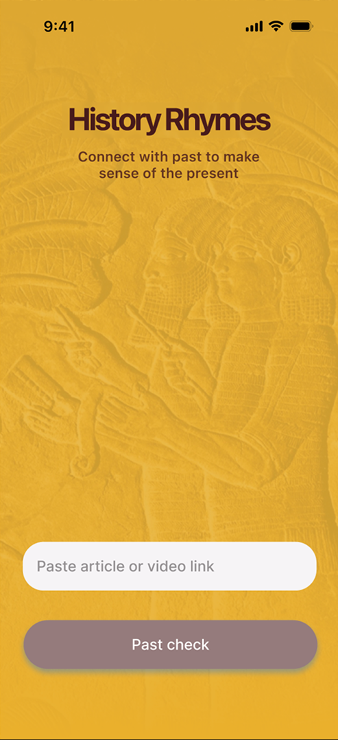 To address this, History Rhymes proposes a mobile application that integrates historical context directly into the news experience. You paste a news article link into the app, which then analyses its themes and matches it with similar historical events. The app presents these connections and explains how past events unfolded, including their social and economic impacts. This transforms passive scrolling into an active, reflective exploration.